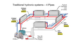 EFFICIENT: Diagram of the four-pipe HVAC system, showing dedicated hot and chilled water lines that enable simultaneous heating and cooling for maximum flexibility, comfort, and efficiency throughout the building.